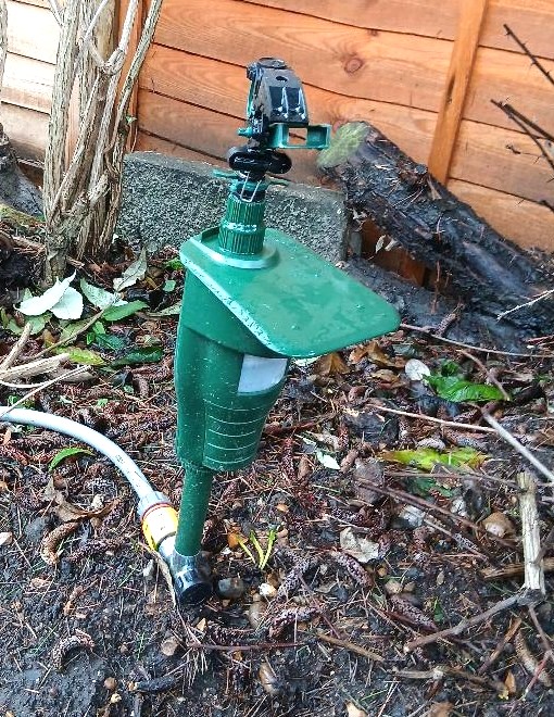 We booked one of their staff to come one Monday morning and he arrived armed with the necessary equipment to see off our invaders. First, he filled the holes with Get Off – the substance we’d already used but we had omitted to put it in the actual holes. Then I showed him the outside tap on the back wall and he disconnected the jet from our hose pipe and attached a battery-powered sprinkler mechanism, complete with Passive Infrared sensor, that came as part of the package we’d purchased.
